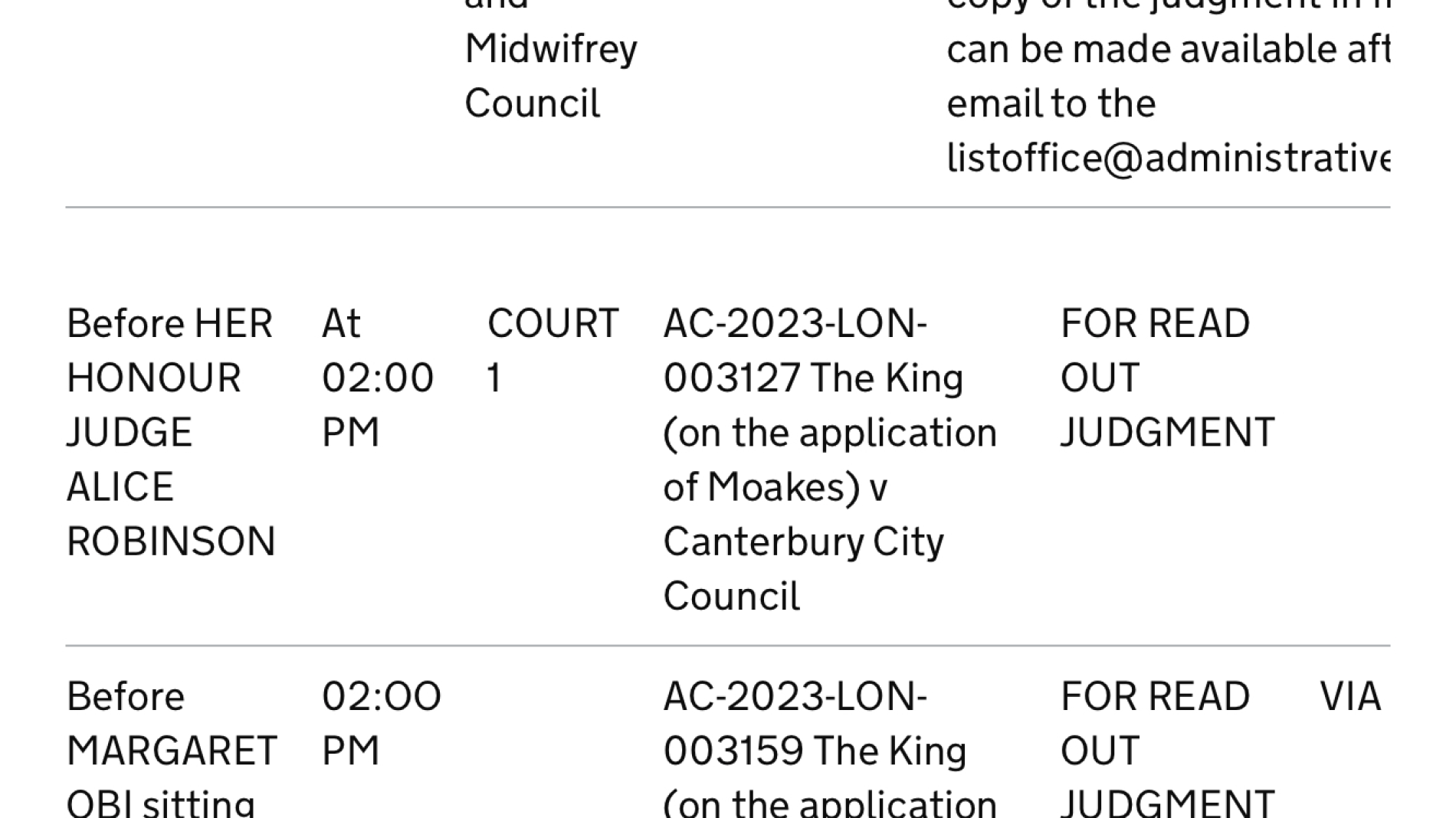 A delay at this stage in proceedings wasn't as disruptive as it could have been earlier: there's no requirement – nor necessarily great benefit – for any of the named parties themselves to attend the actual reading of the judgement, in some ways a formality and often "handed down" in writing only. Parties only need to send a barrister to act on their behalf. The barristers may decide to swap or "sub" as well, for scheduling and practical reasons, as happened on Friday with the defence (the City Council) and HICO.